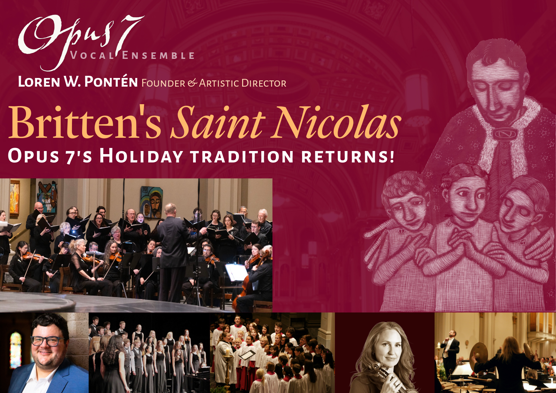 Opus 7 Vocal Ensemble is thrilled to bring back our holiday tradition of Benjamin Britten’s St. Nicolas in the splendor of St. James Cathedral! Come experience this semi-staged production with 100+ singers, instrumental and vocal soloists, historic vestments, piano, organ, and a twenty-piece chamber orchestra comprised of students and professionals. This spectacular cantata tells the story of St. Nicholas of Myrna who performed many miracles including calming the storming seas, saving innocent men from an unjust death, and resurrecting three pickled boys (yes, you read that right). St. Nicholas’ famous generosity and kindness towards the poor and children is the basis for our modern-day Santa Claus. Come hear the true story of the Greek bishop as you experience Britten’s musical masterpiece in the Cathedral’s beautiful acoustic. This concert is not to be missed!